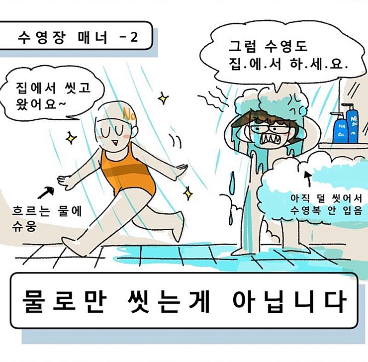 2. 깨끗한 수질보존을 위해 수영장 안에 침을 뱉거나 코를 푸는 행위를 삼가 하여 주시고 물을 항상 깨끗이 사용합니다.